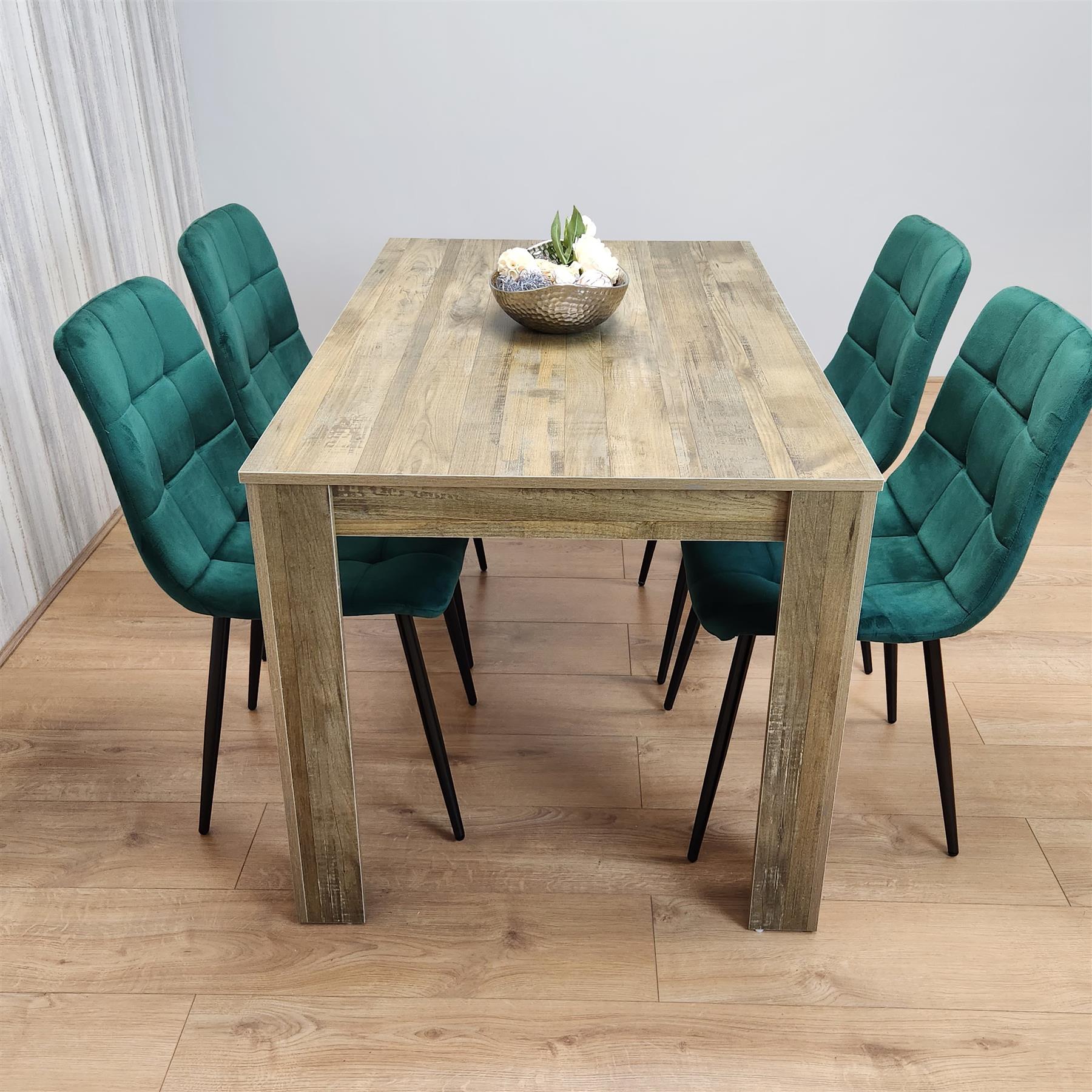 A Stunning wooden brown rustic effect Dining Table set included set of 4 tufted velvet green rocco chairs with slightly curved back design