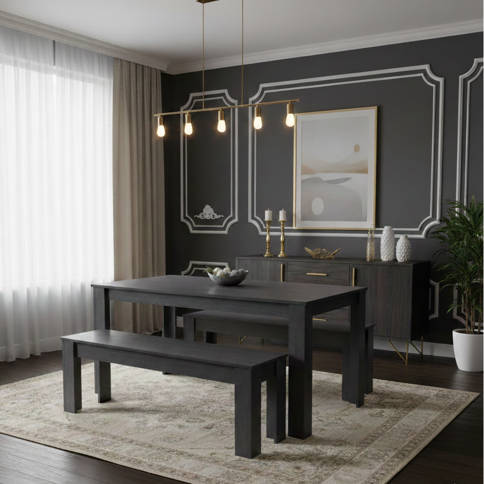 DOUBS Dining Table and 2 Benches Black Dark Grey Wood Dining Set Furniture