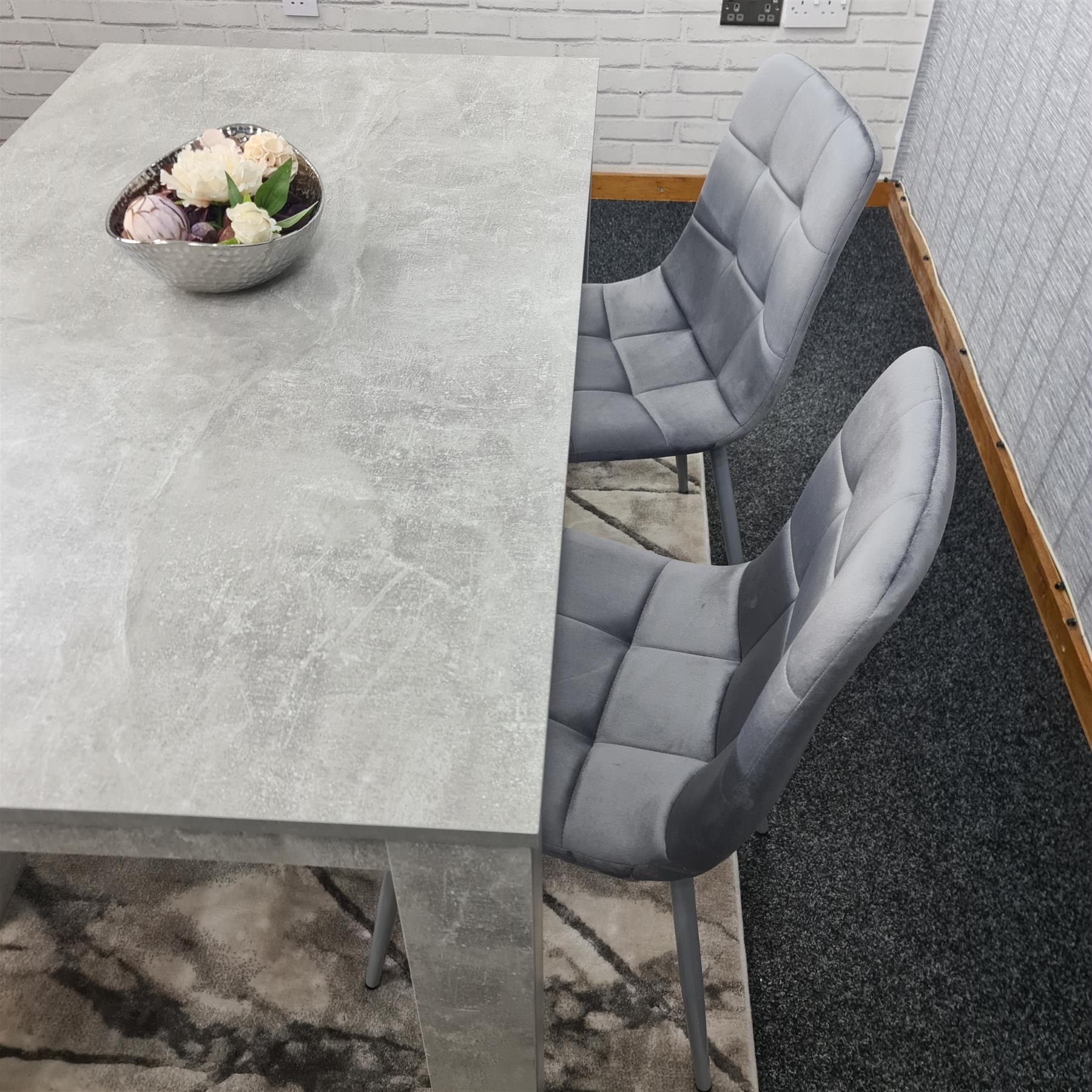 The dinner table is crafted with high-quality MDF with stone grey effect, and a melamine laminated finish to ensure a durable, long-lasting tabletop. The dining chairs are made of premium velvet with metal chair legs