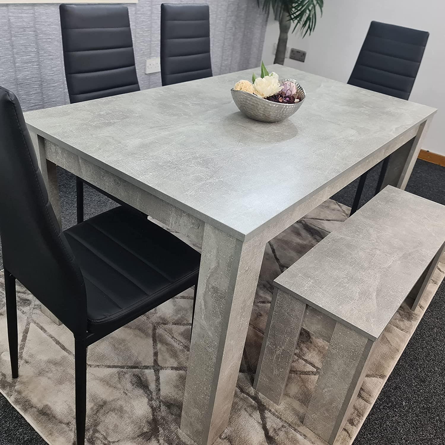 A Stunning wooden stone grey effect Dining Table set with set of 4 leather padded black metal chairs with slightly curved back design for fitting with body shape, and 1 Bench