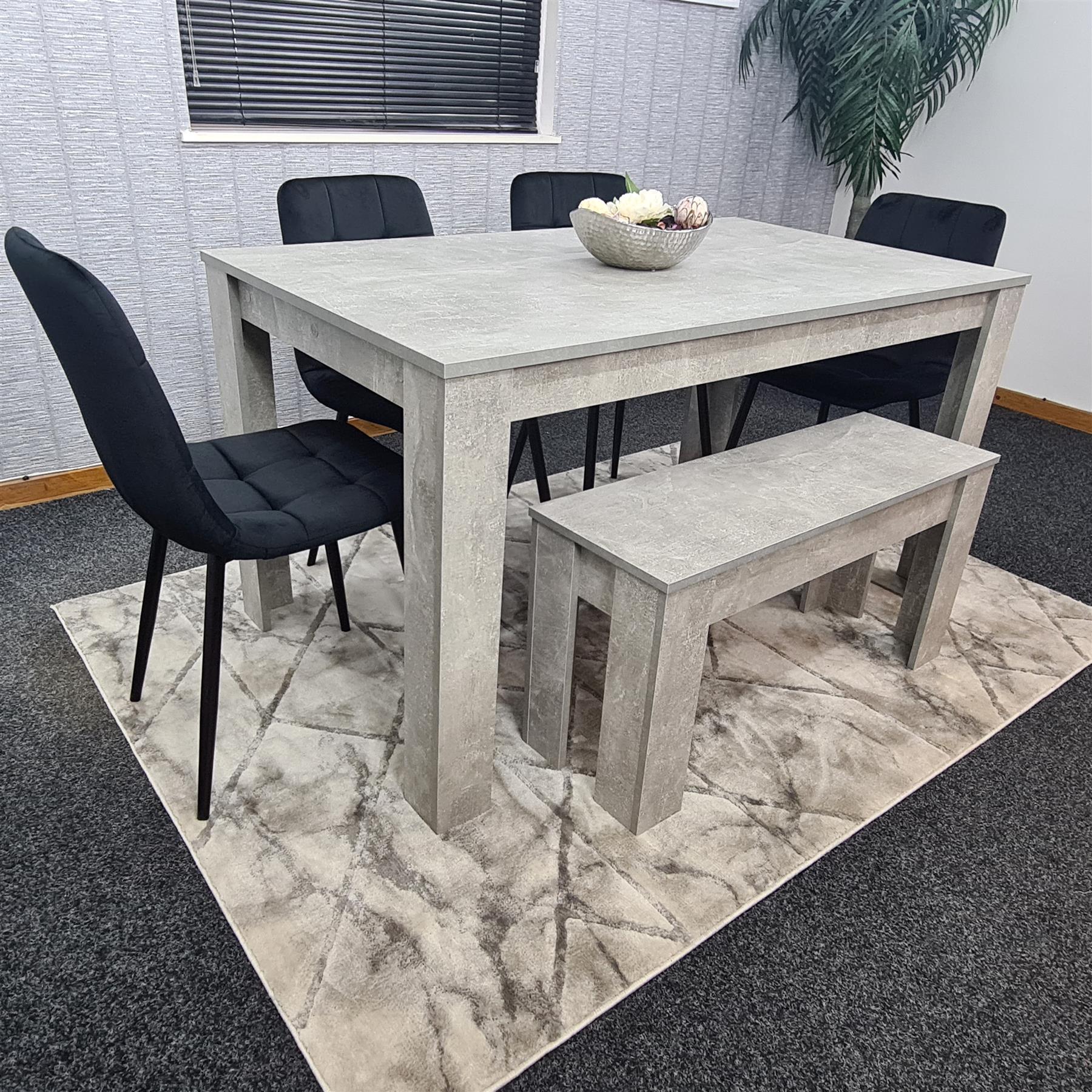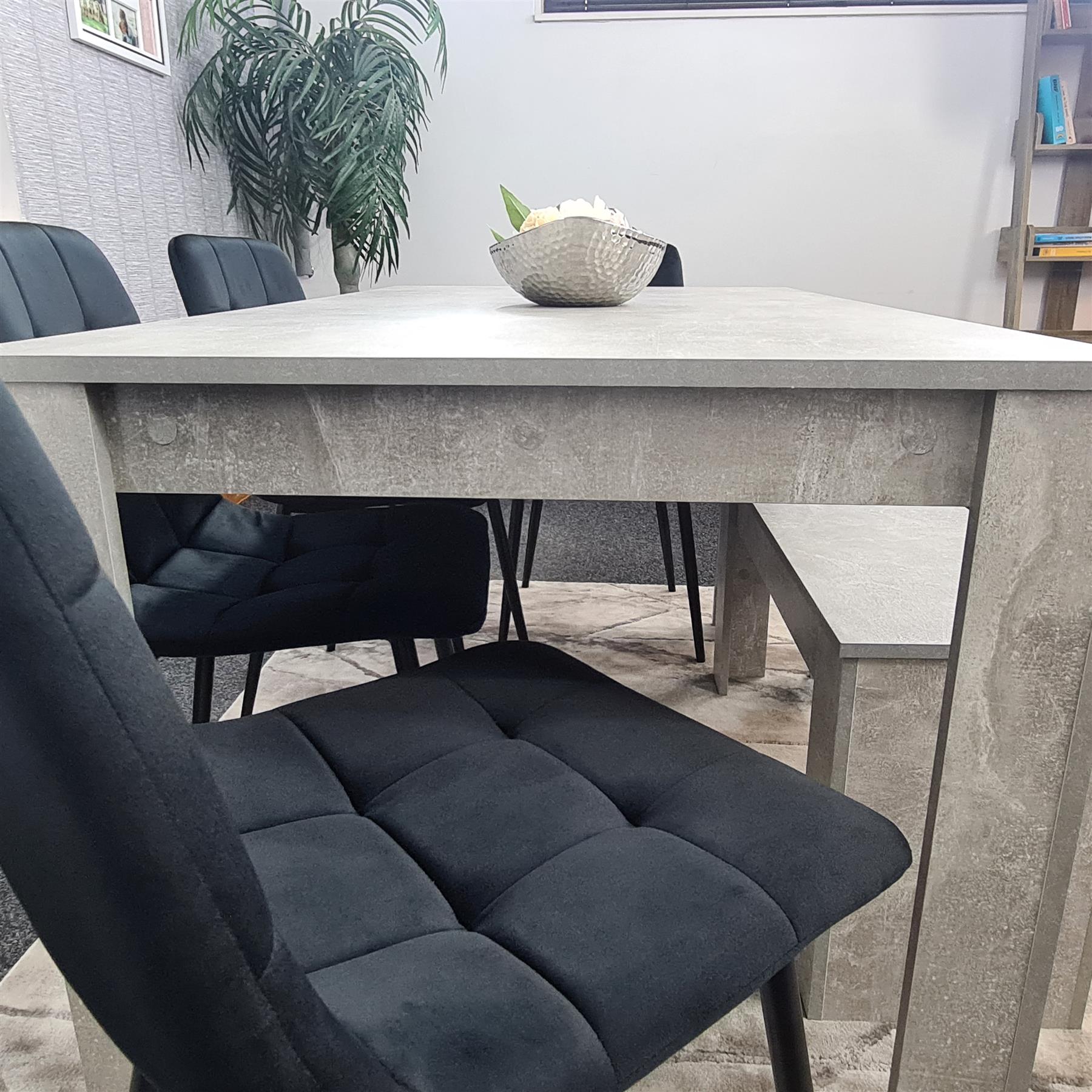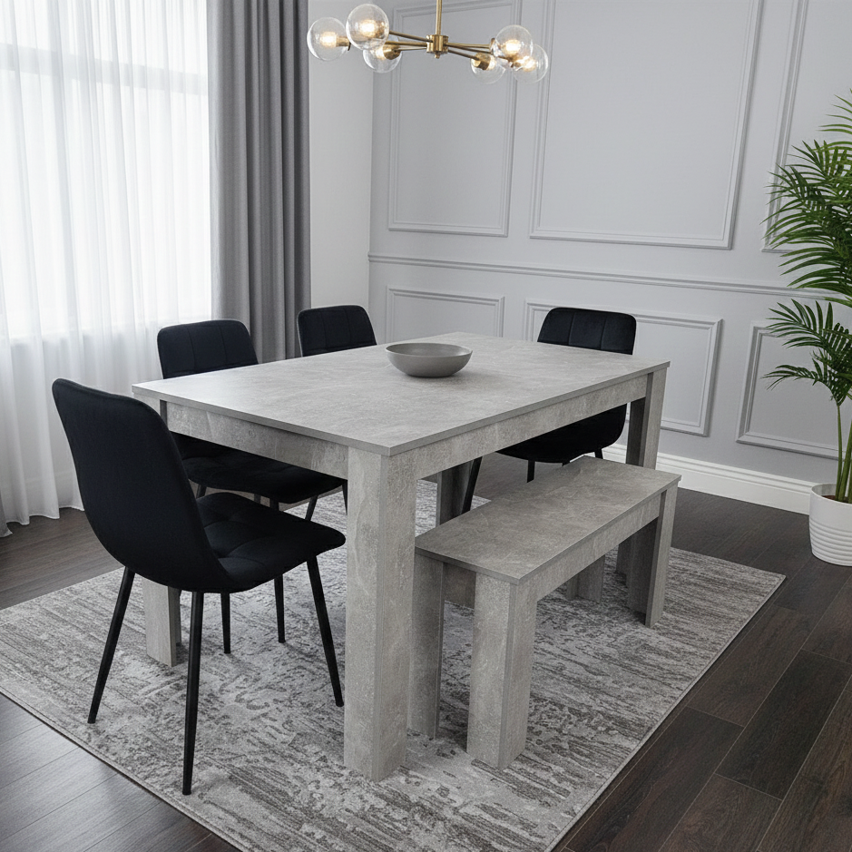 A Stunning wooden stone grey effect Dining Table set with set of 4 tufted velvet black colour rocco chairs with slightly curved back design, and 1 Bench