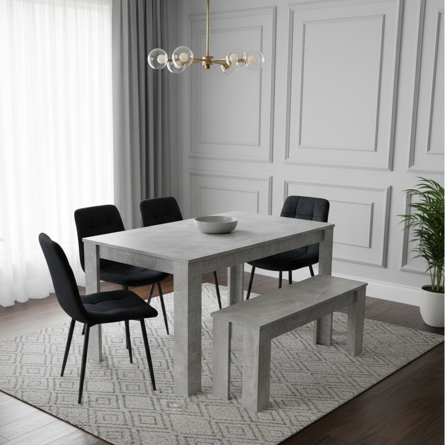 DOUBS Dining Table and 4 Chairs With Bench Stone Grey Effect Wood Table 4 Black Velvet Chairs Dining Room