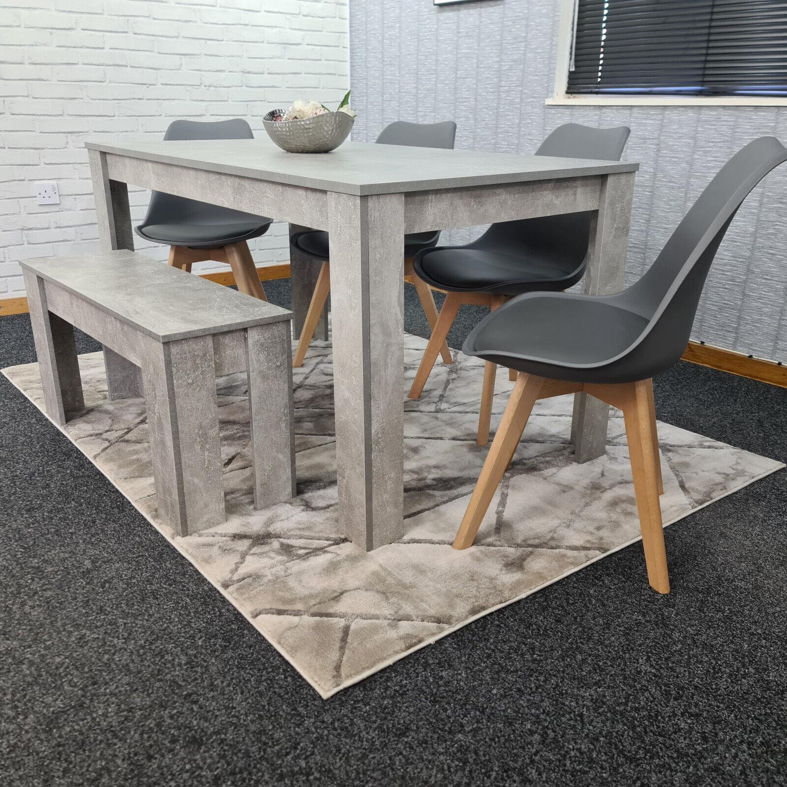 A Stunning wooden stone grey effect Dining Table set with set of 4 grey tulip chairs, and 1 Bench