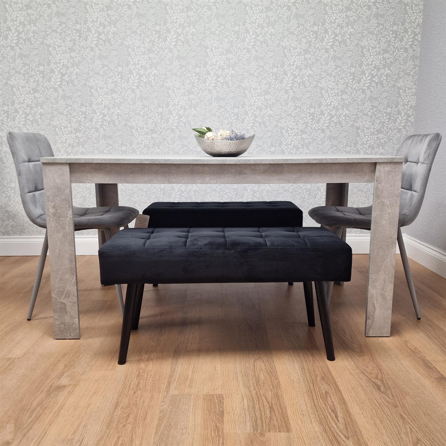 a stone grey finish, complemented by grey velvet chairs with tufted backs for timeless comfort. The padded benches seat are soft, showcasing stylish stitching and tufted details. Table Dimensions - H75 x L117 x W77 CM, Chair dimensions - H87 cm x L59 cm x W44 cm, the seat height of these chairs is 45 cm and Bench dimensions - L90cm x W36cm x H47cm, designed for stability and support. Our Dining table gives us a modern grey aesthetic - Sleek stone grey design enhances contemporary interiors. The chairs have rubber-capped legs that prevent scratches while ensuring stability, and the bench has a Strong Metal Base with Sturdy legs, ensuring stability and long-lasting use. Easy Assembly - Hassle-free setup with clear instructions included.Available table sizes:
