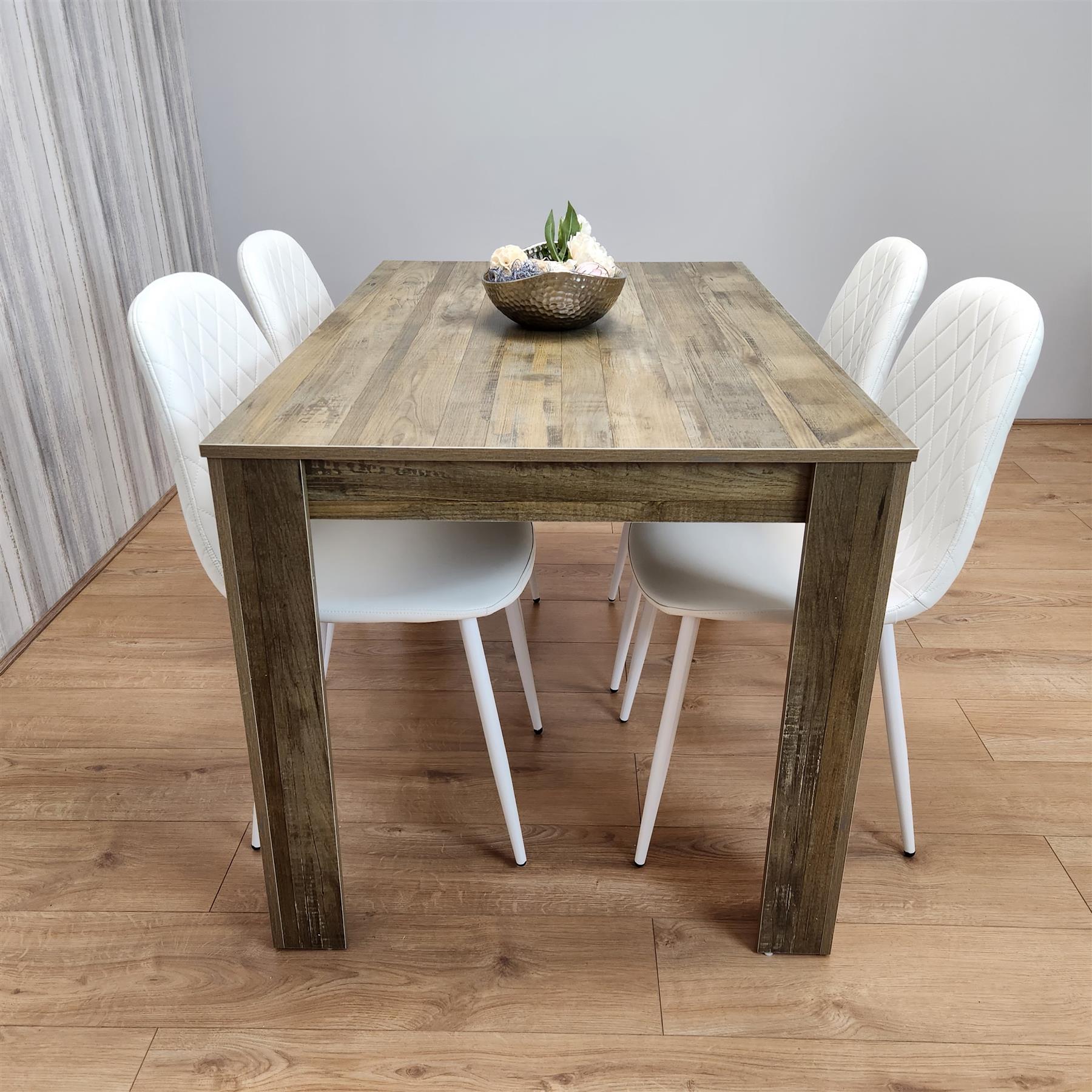 Wooden Dining Table with 4 white Gem Patterned Chairs Rustic Effect Table with white Chairs