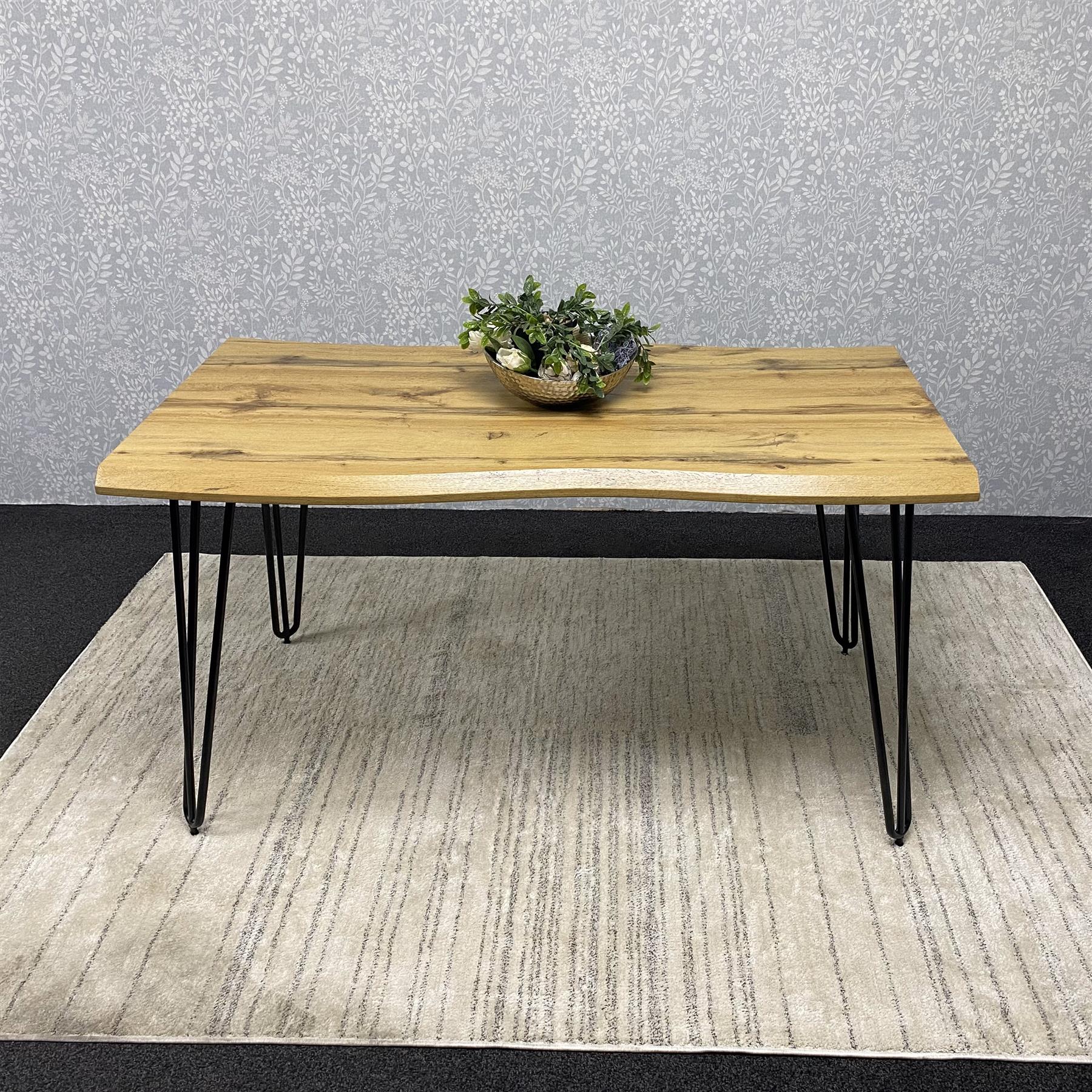 Curved live-edge wooden top – Adds a natural, rustic charm to your space. Durable design – Built for everyday use with a strong and sturdy structure. Metal hairpin legs – Provides stability with a sleek, modern look.Offering ample space. Easy assembly – Comes with clear instructions for a quick setup.Available table sizes: