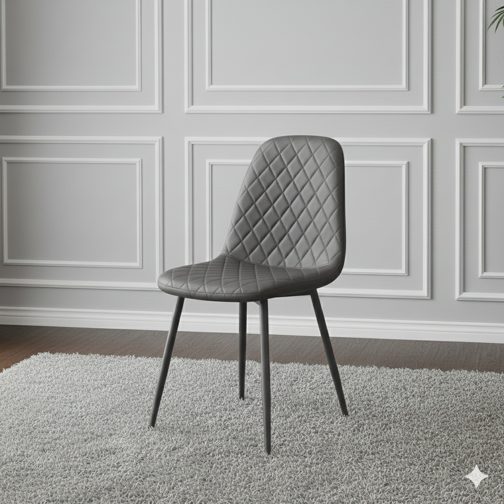 The dining table colour is grey with stone grey effect. The dining chairs colour is grey with diamond-stitched pattern on both the front and back
