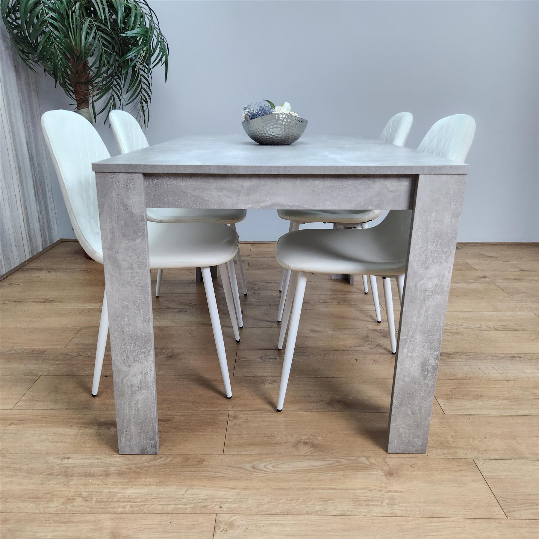 A Stunning wooden stone grey effect Dining Table set with 4 white gem pattern chairs